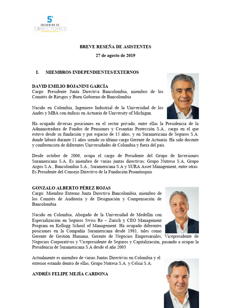 Cargo: Miembro Externo Junta Directiva Bancolombia, miembro de