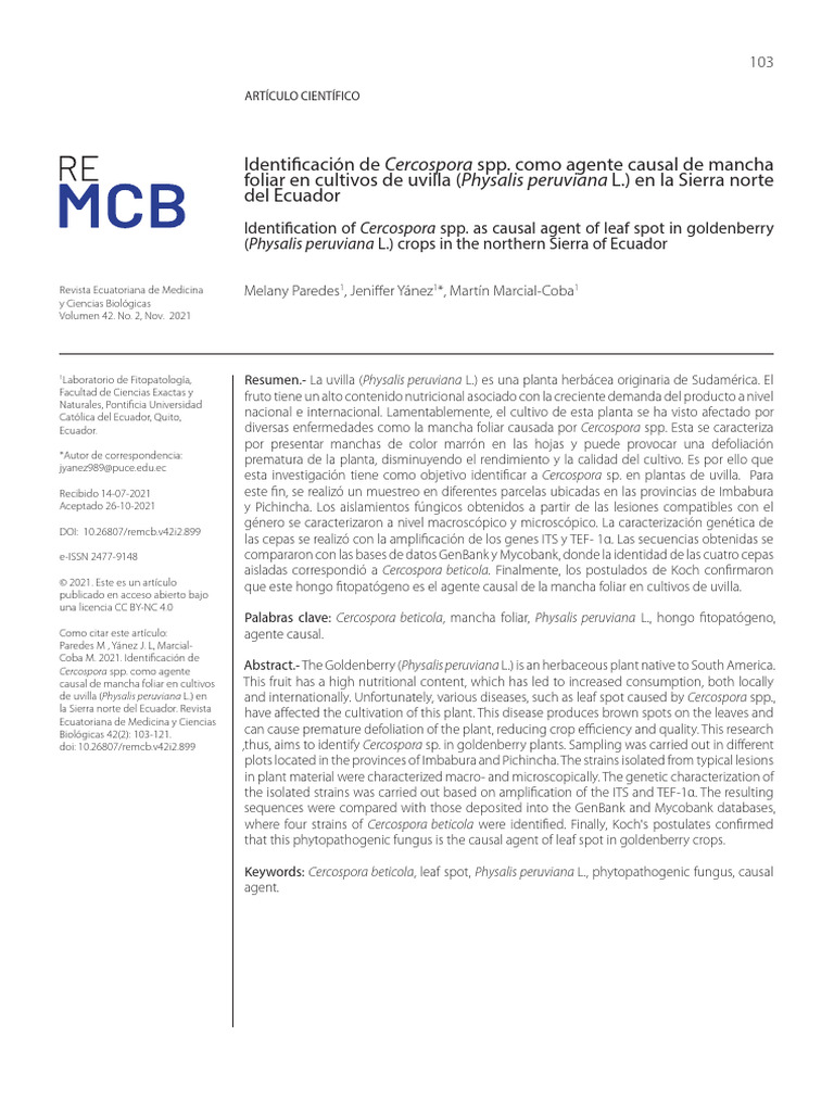 doi: 10.26807/remcb.v42i2.899 ,thus, aims to identify Cercospora sp. in goldenberry plants. Sampling was carried out in different