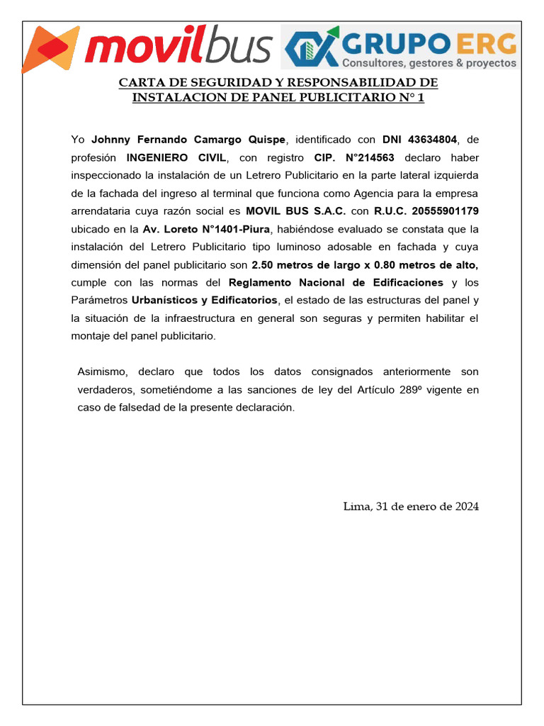 INSTALACION DE PANEL PUBLICITARIO N° 1
