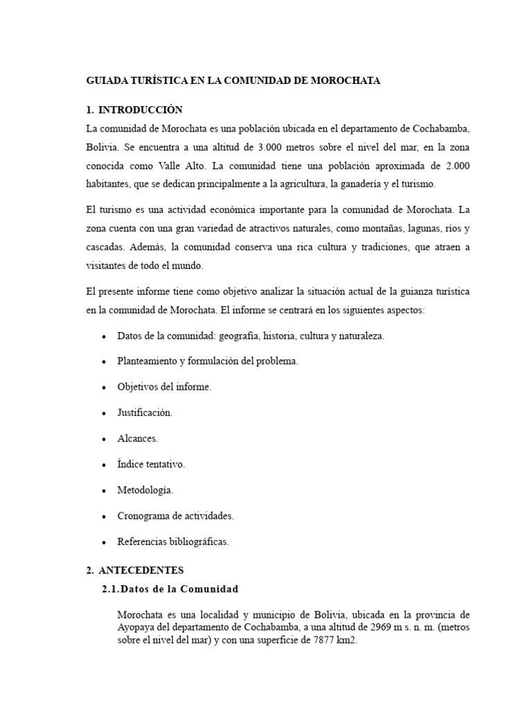 en la comunidad de Morochata. El informe se centrará en los siguientes aspectos: