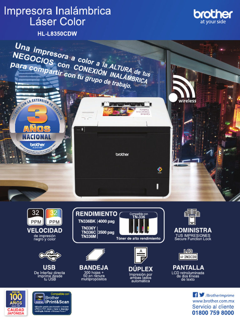 la Brother HL-L8350CDW ™. Cuenta con una velocidad de impresién en color y blanco y negro de 32 ppm, capacidad de la bandeja principal de