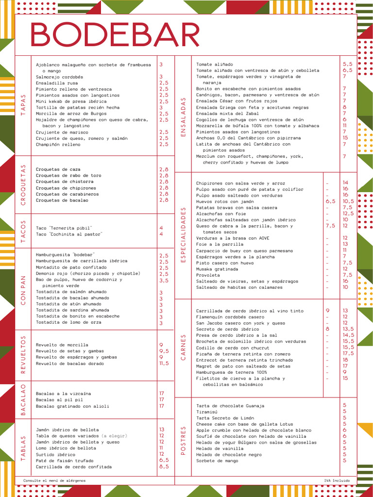 Consulte el menú de alérgenos IVA Incluido