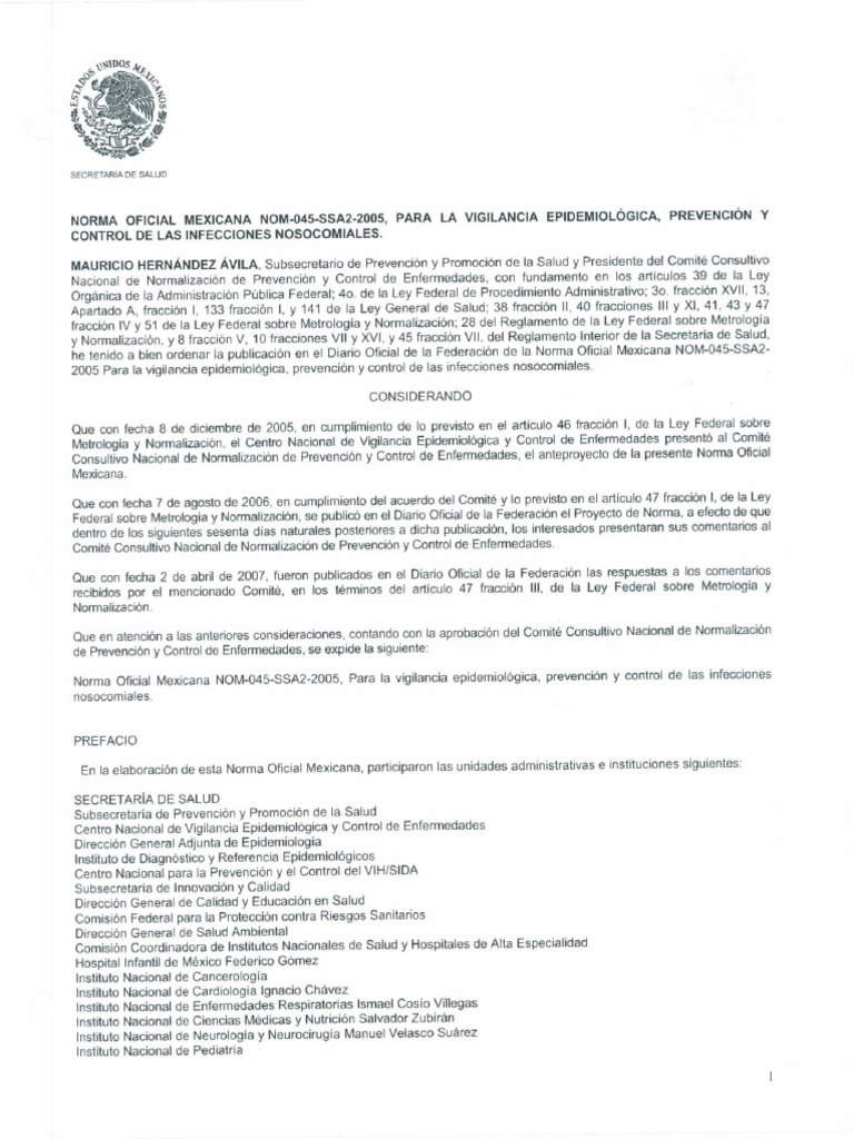 Norma Oficial Mexicana NOM-045-SSA2-2005, Para la vigilancia epidemiologica, prevencién y control de las infecciones
