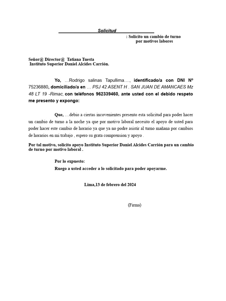 Por tal motivo, solicito apoyo Instituto Superior Daniel Alcides Carrión para un cambio
