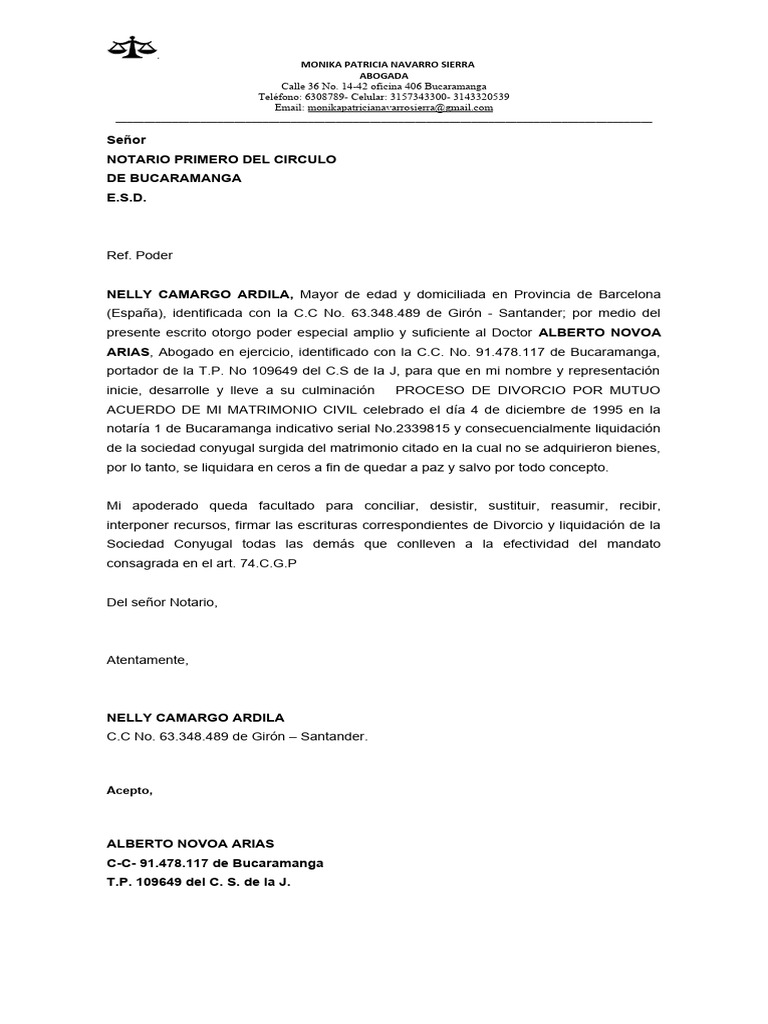 nombre y representación firme la correspondiente escritura pública de divorcio y