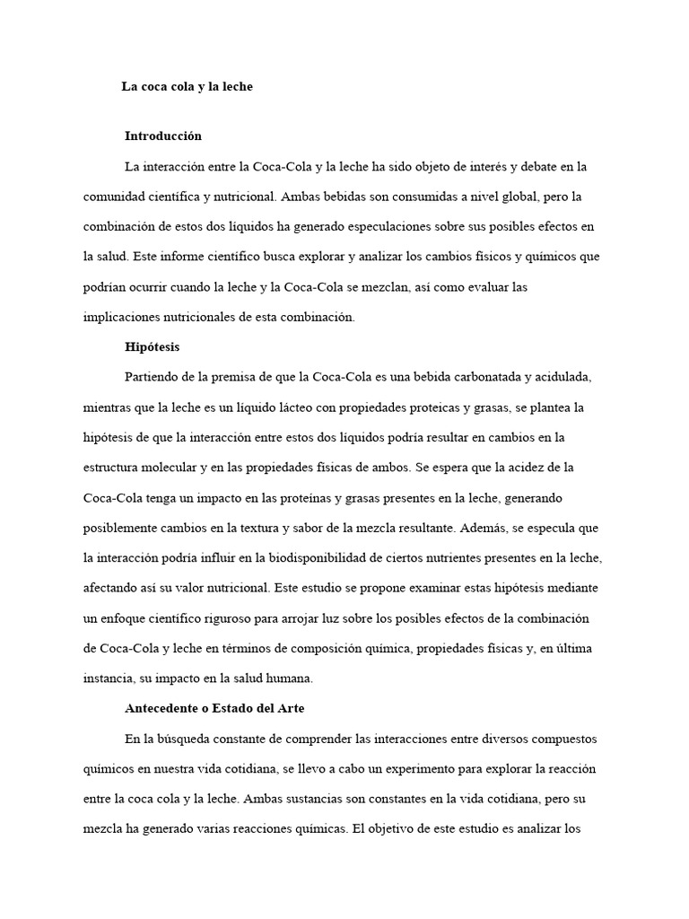 Cola y leche, explorando sus cambios químicos, físicos y nutricionales al mezclarse. Los