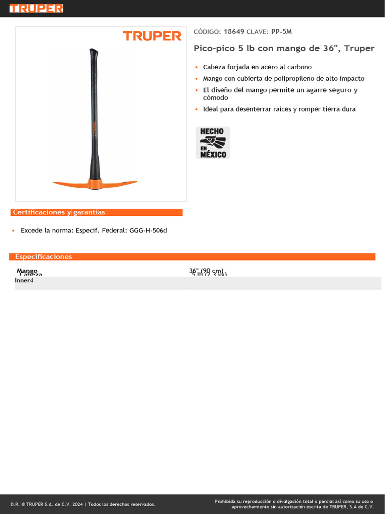Pico-pico 5 lb con mango de 36", Truper