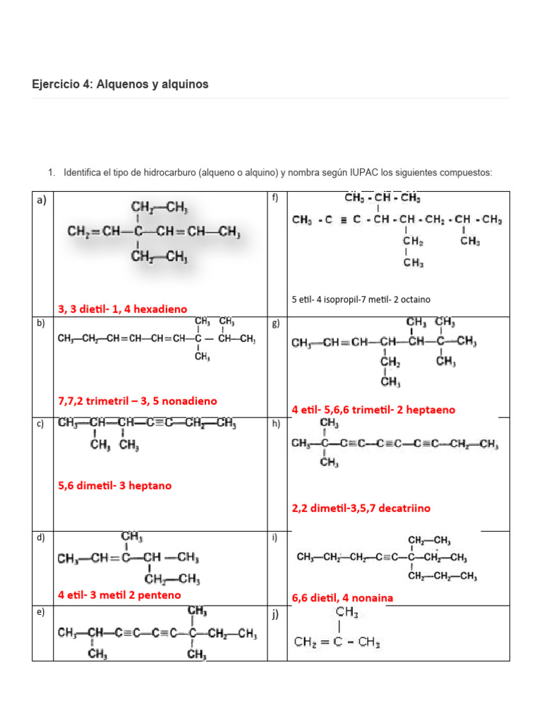 1. Identifica el tipo de hidrocarburo (alqueno o alquino) y nombra según IUPAC los siguientes compuestos: