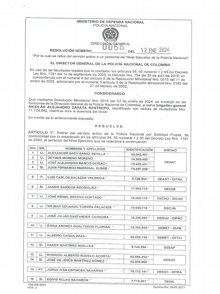 “Por la cual se retira del servicio activo a un personal del Nivel Ejecutivo de la Policia Nacional”
