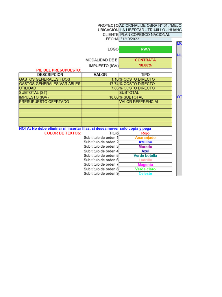 NOTA: No debe eliminar ni insertar filas, si desea mover sólo copia y pega