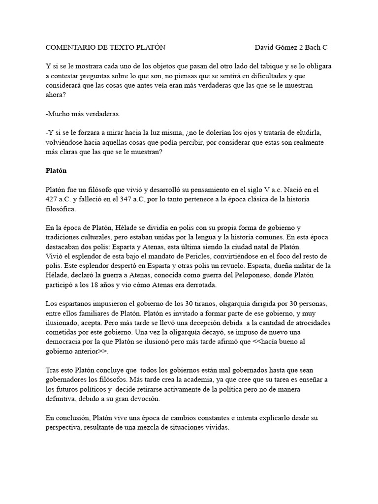 COMENTARIO DE TEXTO PLATÓN David Gómez 2 Bach C