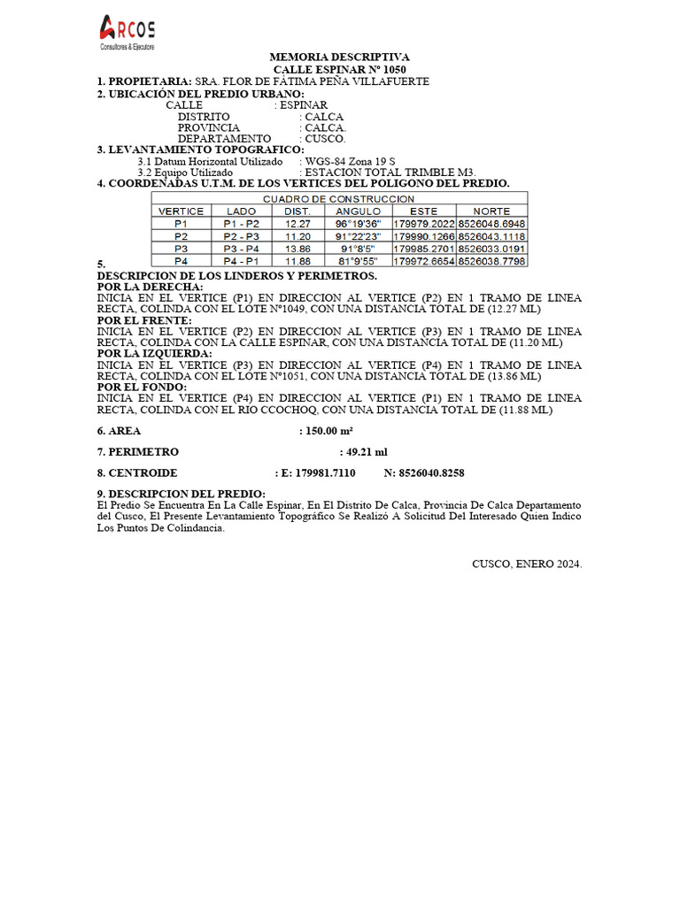 del Cusco, El Presente Levantamiento Topográfico Se Realizó A Solicitud Del Interesado Quien Indico