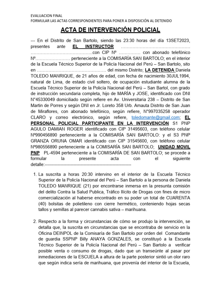 en ………………………………………… del mismo Distrito; LA DETENIDA Daniela