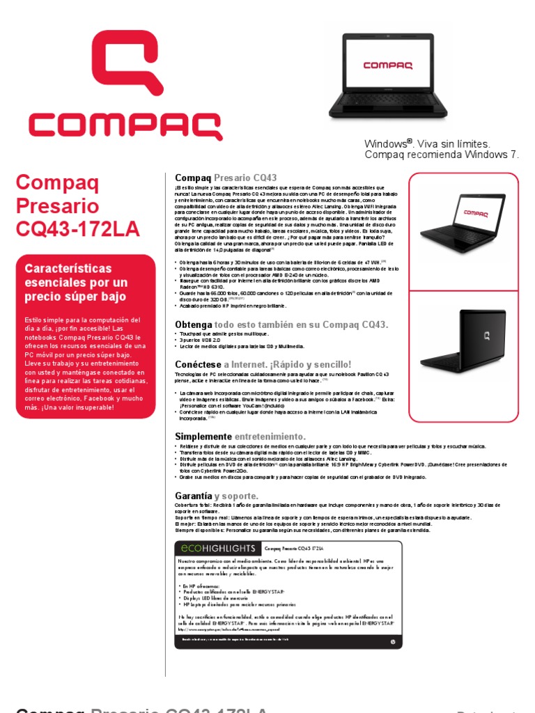 El estilo simple y las caractersticas esenciales que espera de Compaq son ms accesibles que nunca! La nueva Compaq Presario CQ43 mejora su vida con una PC de desempeo total para trabajo y entretenimiento, con caractersticas que encuentra en notebooks mucho ms caras, como compatibilidad con video de alta definicin y altavoces estreo Altec Lansing. Obtenga WiFi integrada para conectarse en cualquier lugar donde haya un punto de acceso disponible. Un administrador de configuracin incorporado lo acompaa en este proceso, adems de ayudarlo a transferir los archivos de su PC antigua, realizar copias de seguridad de sus datos y mucho ms. Una unidad de disco duro grande tiene capacidad para mucho trabajo, tareas escolares, msica, fotos y videos. Es toda suya, ahora por un precio tan bajo que es difcil de creer. Por qu pagar ms para sentirse tranquilo? Obtenga la calidad de una gran marca, ahora por un precio que usted puede pagar. Pantalla LED de alta definicin de 14,0 pulgadas de diagonal(8) Obtenga hasta 6 horas y 30 minutos de uso con la batera de litio-ion de 6 celdas de 47 WH.(28) Obtenga desempeo confiable para tareas bsicas como correo electrnico, procesamiento de texto y visualizacin de fotos con el procesador AMD E-240 de un ncleo. Navegue con facilidad por Internet en alta definicin brillante con los grficos discretos AMD Radeon HD 6310. Guarde hasta 66.000 fotos, 60.000 canciones o 120 pelculas en alta definicin(8) con la unidad de disco duro de 320 GB.(29)(30)(31) Acabado premiado HP Imprint en negro brillante.
