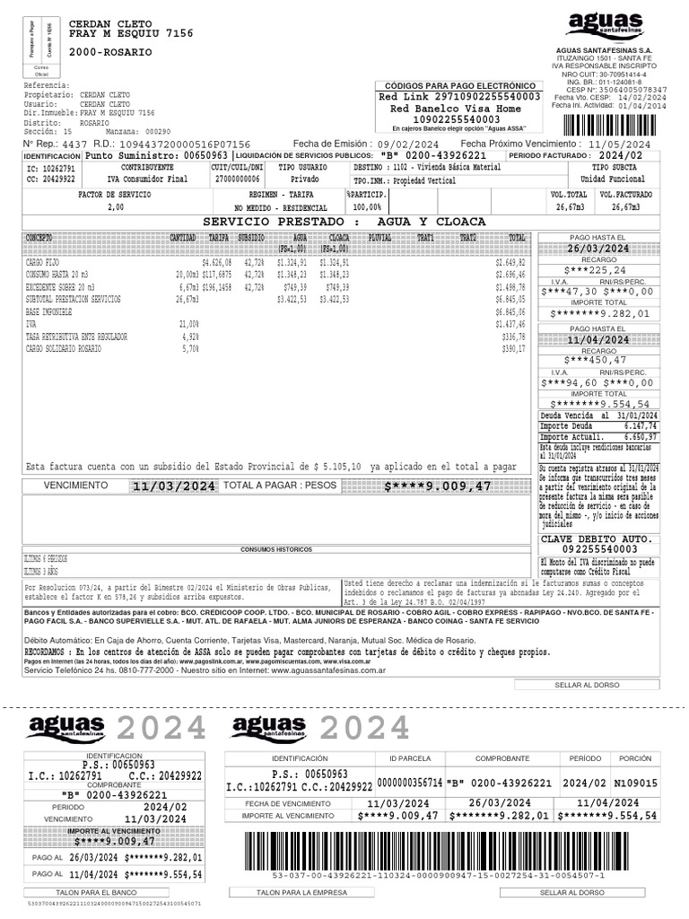 Esta factura cuenta con un subsidio del Estado Provincial de $ 5.105,10 ya aplicado en el total a pagar Su cuenta registra atrasos al 31/01/2024