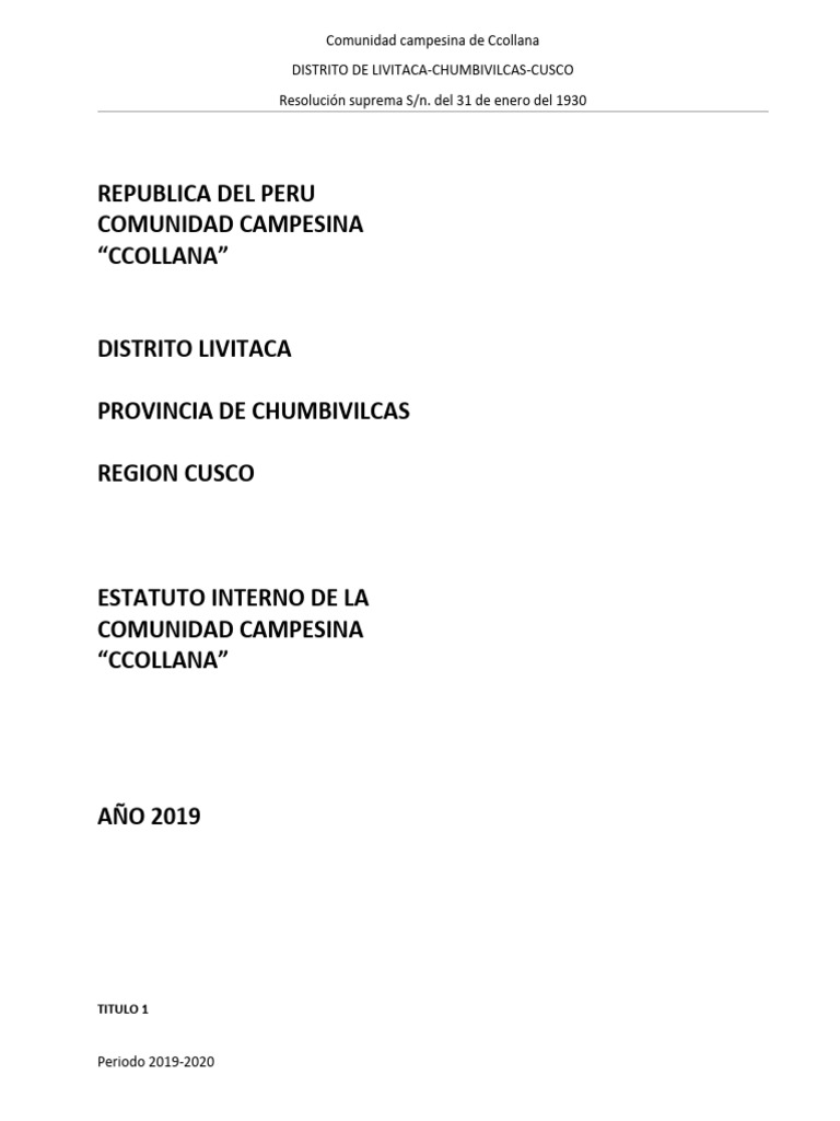 ARTÍCULO 01.- El presente estatuó interno de la comunidad campesina de ccollana. Es un instrumento normativo con