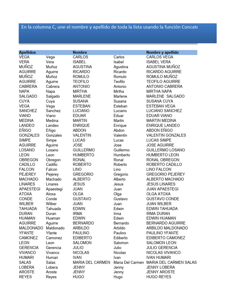 En la columna C, une el nombre y apellido de toda la lista usando la función Concatenar