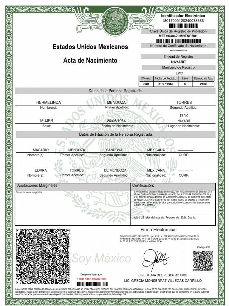 Estados Unidos Mexicanos Número de Certificado de Nacimiento