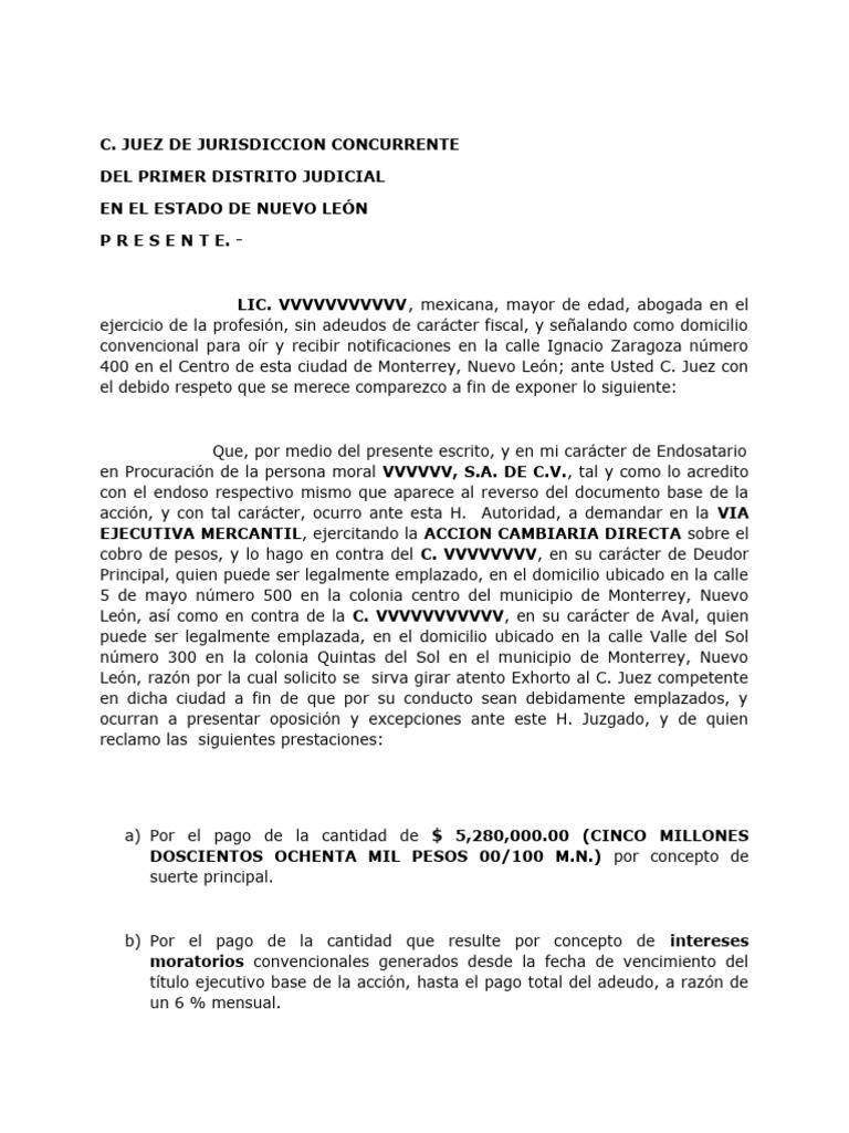 cobro de pesos, y lo hago en contra del C. VVVVVVVV, en su carácter de Deudor