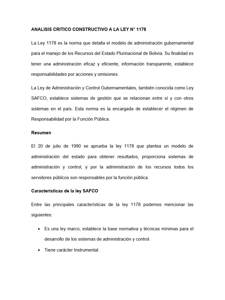 ANALISIS CRITICO CONSTRUCTIVO A LA LEY N° 1178