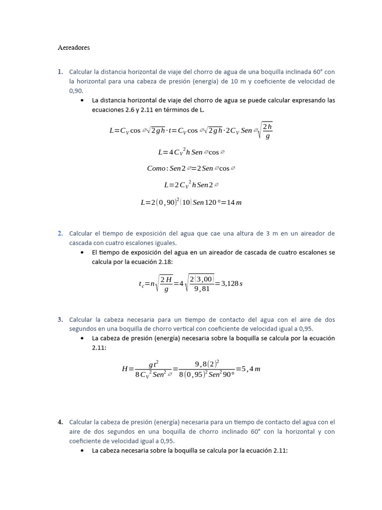 3. Calcular la cabeza necesaria para un tiempo de contacto del agua con el aire de dos