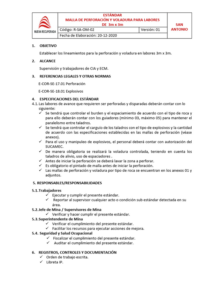 Establecer los lineamientos para la perforación y voladura en labores 3m x 3m.