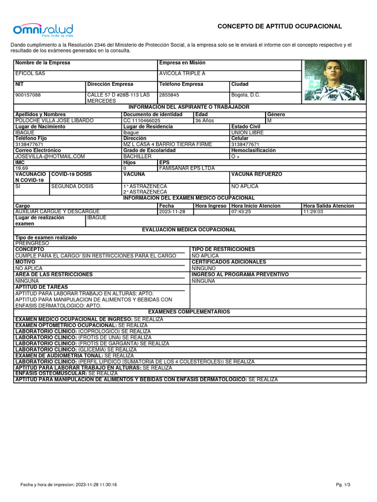 Durante su evaluación médica ocupacional se realizó revisión de los antecedentes de vacunación, en el momento cuenta con esquema de vacunación
