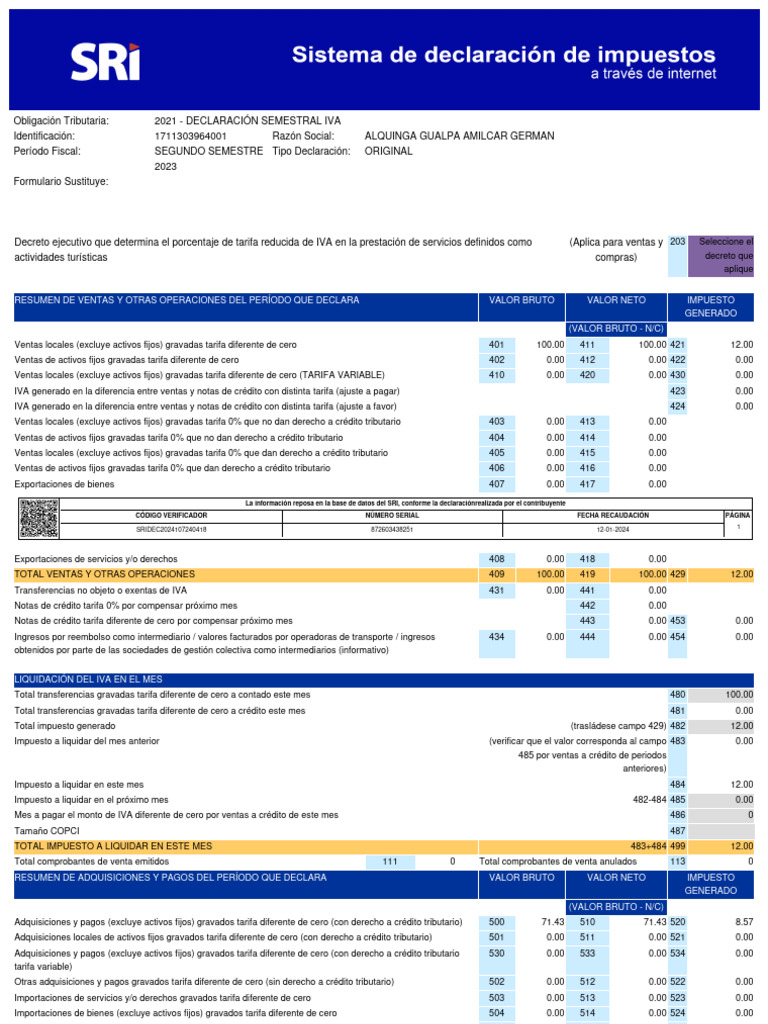 Obligación Tributaria: 2021 - DECLARACIÓN SEMESTRAL IVA