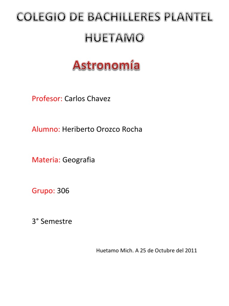 La Astronoma es una de las disciplinas cientficas que en los ultimos aos a estado alcanzando un mayor desarrollo, tanto que la tecnologia nueva va permiento estudiarla mas a fondo, y a la vez esta es una de las diciplinas o ciencias que interesan cada dia mas a las personas ya que esa ciencia es la que se encarga de estudiar los cuerpos celeste de nuestro gran universo. Nuestro sistema solar esta formado por nueve planetas y otros muy pequeos. Todos de origen que no se sabe ya que hay bastantes teorias relaconadas con esto, Pero lo que si sabes gracias a la astronoma esque lo planetas giran alrededor del Sol en rbitas elpticas de excentricidad muy variable. La velocidad de desplazamiento tambin es diferente.Algunos planetas son visibles desde nuestra tierra en algun tiempo, ya que esos planetas pasan muy cerca de nuesta orbita y se pueden alcansar a observar. El sistema solar tambin esta configurado por satlites, estrellas, cometas, etc. Bueno no solo el sistema solar si no inmensidades de galaxis ya que todas las galaxias posees eso. La Luna que es el satlite ms grande con relacin al tamao de su planeta y el nico de la Tierra Y la luna es el unico cuerpo o satelite o planeta que ha pisado el hombre fuera de la Tierra, y tambien gracias a la Luna hay Marea. Tambin existen fenmenos, como los eclipses, estos son la combinacin de movimientos de los tres astros Luna, Sol y Tierra de estos hay dos tipos: lunares y solares. Bueno aqui estoy hablando de todo un poco ya que la astronomia estudia todos estos tipos de fenomenos que dan curiosidad, en el transcurso de este trabajo usted vera y comprendera conceptos relacionados con la astronomia y contestara algunas de sus dudas o preguntas que tenga acerca del universo y todo lo que se encuentre en l. En este trabajo espero compartirles grande conceptos y sabiduria para que ustedes le tomen importancia a la astronomia o tengan curiosidad, as como la mia de aprender ms. Tambien esta diciplina se apoya mucho de la fisica, ya que la fisica la complementa y ayuda a resolver algunos casos o problemas que est presenta, tambien asi como las matematicas, para medir distancias, etc. Desde tiempos muy remotos el hombre a estudiado los astros y el universo, y entonces desde hace tiempo la astronomia ha existido y gracias a ella nos podemos dar cuenta de muchas que cosas, y entender como se comporta nuestra galaxia y porque no, todo el universo, las leyes que lo rigen, los fenomenos que ocurren, el movimiento de los astros etc.