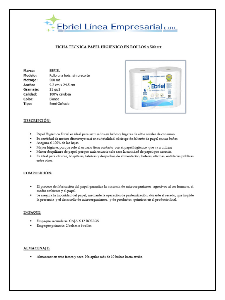 FICHA TECNICA PAPEL HIGIENICO EN ROLLOS X 500 MT