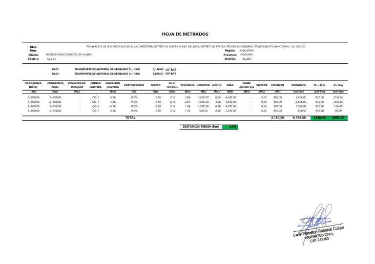 Obra: “REPARACIÓN DE VIAS VECINALES; EN EL(LA) CARRETERA DISTRITO DE VALERA ANEXO DILLENTA, DISTRITO DE VALERA, PROVINCIA BONGARA, DEPARTAMENTO AMAZONAS” CUI: 2603575