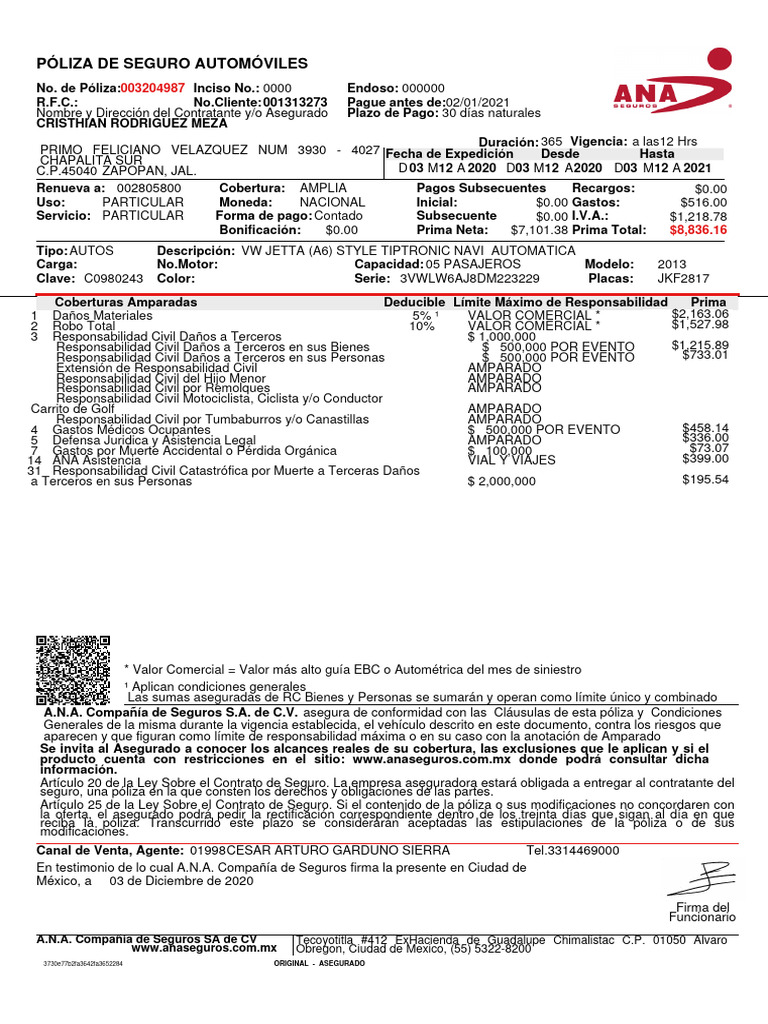 No. de Póliza:003204987 Inciso No.: 0000 Endoso: 000000