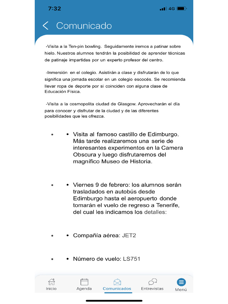 Inicio Agenda Comunicados —_Entrevistas ~— Menus. © Horario: Salida: Edimburgo — 11:20 h.