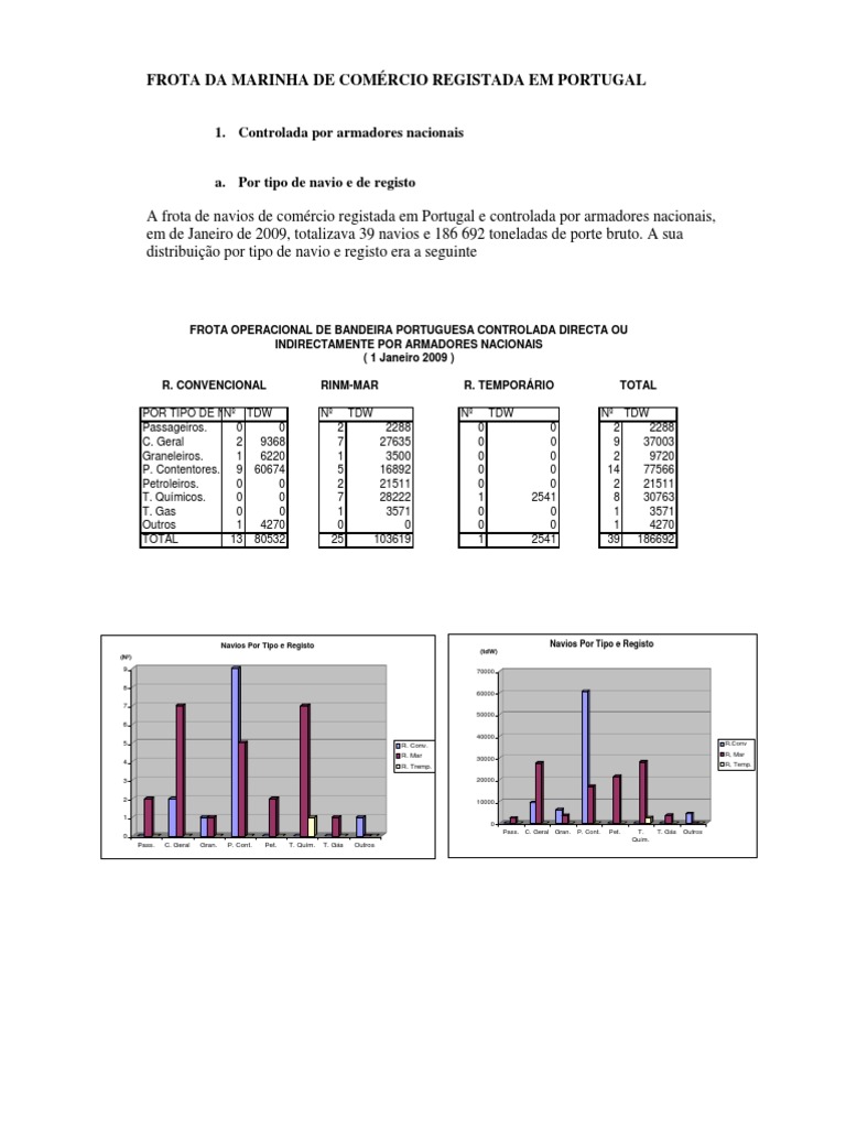 432.045 1.414.000 2.129 2002 20 86.505 1993 28 457.378 92 694.076 1997 17 249.619 89 903. desde a sua criação em 1990.993 11.790 24 339.864 1.326 116 950.940 1.161. EVOLUÇÃO DA FROTA REGISTADA NO RINM-MAR (Em 1 de Janeiro) NAVIOS EM NOME DE ARMADORES ANO PORTUGUESES OU DE EMPRESAS CONTROLADAS POR ARMAD.837 72 525.362 0 4 26.876 2008 21 71.320.000 2.600.361 2001 23 166.111.158.104 982.723 2004 20 78.011 75 1.407 106 1.564 463.050.601 93 606.2 Evolução da frota de comércio registada no RINM-Mar e controlada por armadores nacionais e estrangeiros O quadro e gráfico seguinte referem a evolução da frota registada no RINM-MAR.371 2007 20 82.052.667 1.086 117 920.698 107.247 86.736 35.727 109.425 330. 80% da frota de comércio registada no Mar corresponde a interesses estrangeiros.923 1.725 1.526 230.000 1. Fonte:IPTM.162 1994 25 413.007.154.736 35.521.243 107 862.211 1.200. Nº ARQ TDW ARMADORES ESTRANGEIROS Nº ARQ TOTAL TDW Nº ARQ TDW 1990 1 1.424 114 980.215 1999 21 155.346 2000 24 220.362.362 1992 6 7.388 1.555.PORT.398 1.469 86 1.032 64 562.013.510 37 343.396.540 1.645 1.338 914.749 1.919 1.437 103.145 135 906.000 1.535 1995 23 373.993 1.974 808.357.145.556 713.591 1.166 953. situação que tem vindo a acentuar-se.145.000 200. Em 1 de Janeiro de 2009.464.312 1.619 35 761.000.451 250.881 105.135.217 117 796.220 112.745 2005 19 78.660 105 999.505 0 6 7.617 116.664 47 312.912 140 962.699 1.856 2009 25 77.000 1.023 1.602. Nacionais F.207 763.842 1.916 10 348.592 1.428 1.274 1.023 47 713.011 347.000 800.218 1.044 720.221 1.985 5 388.270.419 96 871.696 1998 20 168.467 649.800 1991 4 26.540 519.993 11. .283.692 137 1. Controlada por A.566 54 548. de Armadores Estrangeiros Da sua análise podemos constatar o carácter eminentemente internacional do referido registo.800 0 1 1.085.000 600.813 1996 17 205.003.092 1.IP/DSAS/DTM-Publicações “Armadores e Navios” e ” Evolução da Frota Controlada por Armadores Nacionais” referentes a 1 de Janeiro de 2009.216 111 686.266.512 85 920.043 ( tdw ) Evolução da Frota do Rinm-Mar 1.473.172 2006 20 82 535 112.618 250.177 33 846.000 19 90 19 91 19 92 19 93 19 94 19 95 19 96 19 97 19 98 19 99 20 00 20 01 20 02 20 03 20 04 20 05 20 06 20 07 20 08 20 09 0 F.666 110 932.774 2003 17 79. a partir de 1994.949 743.099.059.000 400.566 795.360 95 1.400.445.655 806.190 89 861.745 114 761.480 90 783.