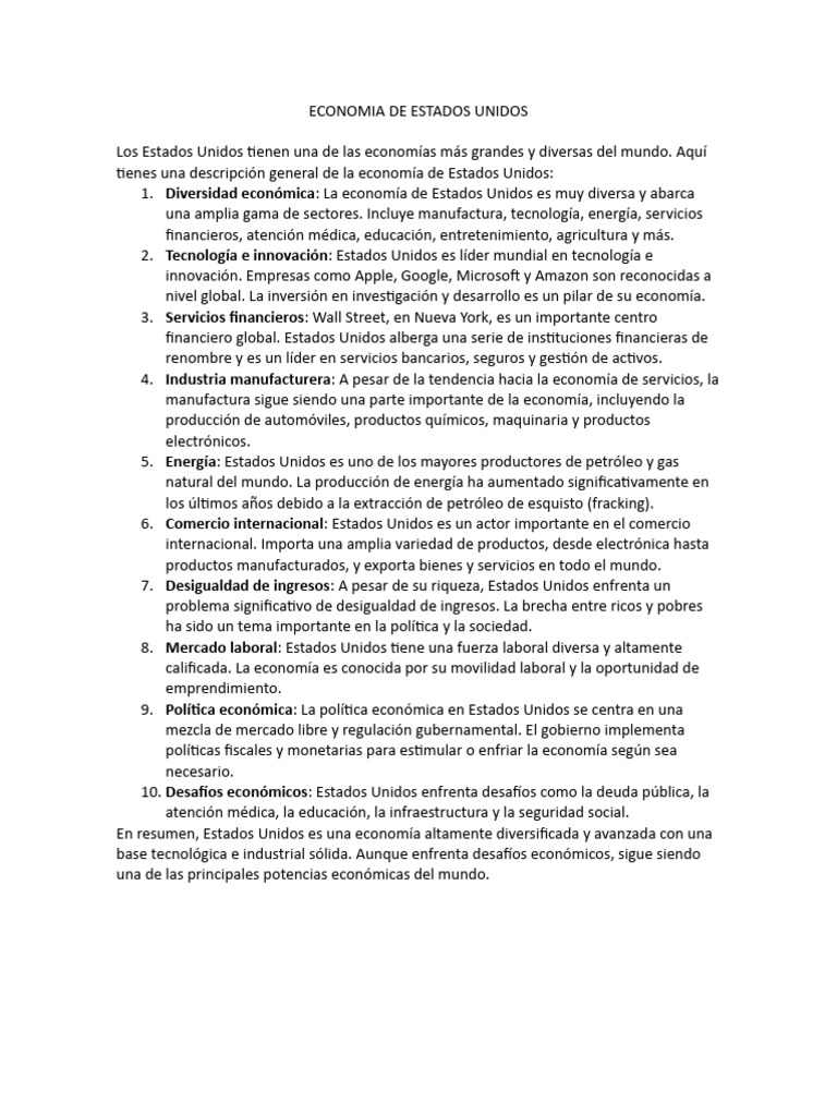 En resumen, Estados Unidos es una economía altamente diversificada y avanzada con una