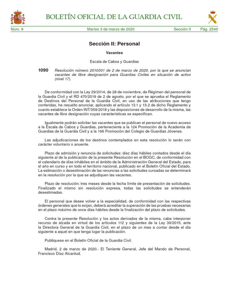 vacantes de libre designación para Guardias Civiles en situación de activo