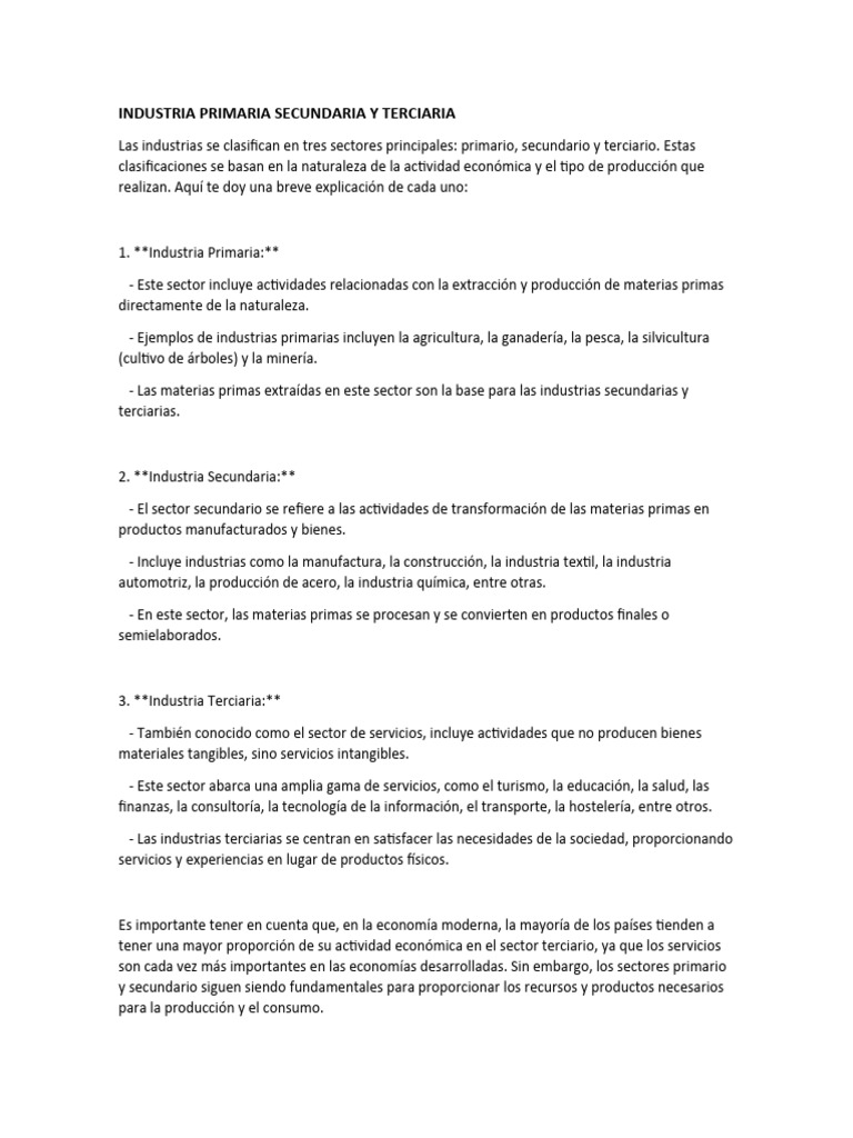 Las industrias se clasifican en tres sectores principales: primario, secundario y terciario. Estas