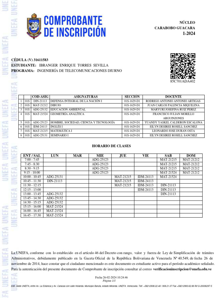 Para la autenticación del presente documento de Comprobante de inscripción consultar al correo verificacioninscripcion@unefa.edu.ve