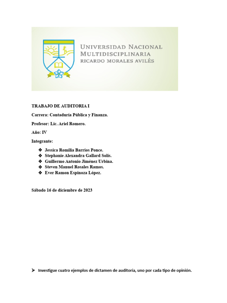 Investigue cuatro ejemplos de dictamen de auditoría, uno por cada tipo de opinión.