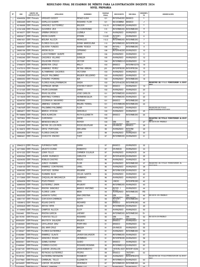 RESULTADO FINAL DE CUADROS DE MÉRITO PARA LA CONTRATACIÓN DOCENTE 2024