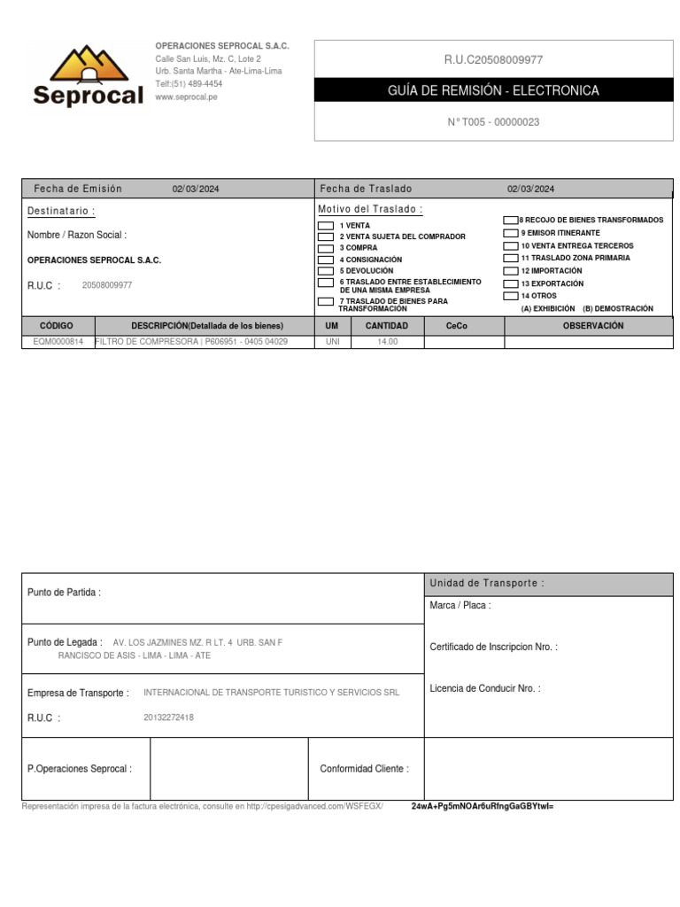 Fecha de Emisión 02/03/2024 Fecha de Traslado 02/03/2024