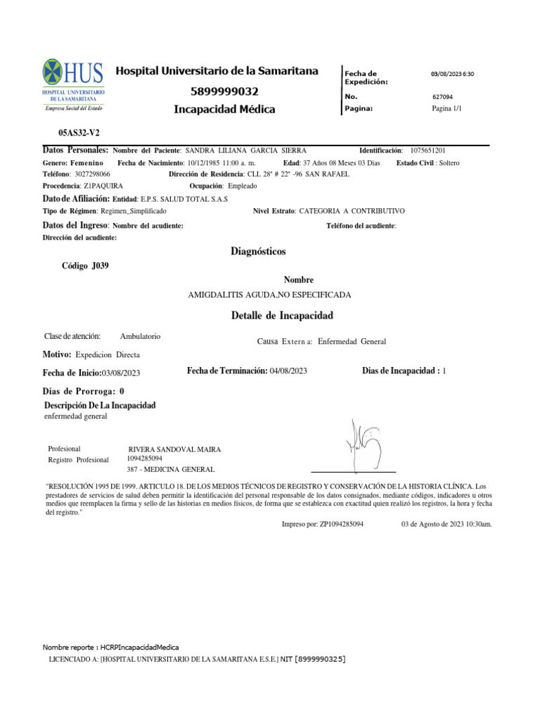 Fecha de Inicio:03/08/2023 Fecha de Terminación: 04/08/2023 Dias de Incapacidad : 1