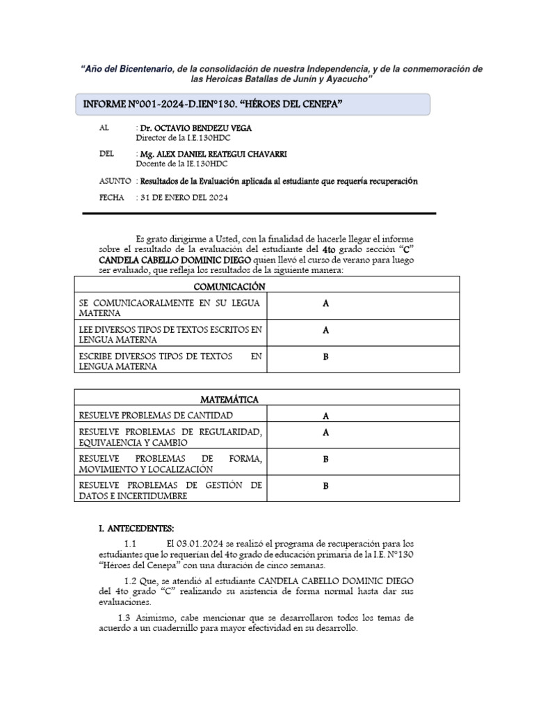 ASUNTO : Resultados de la Evaluación aplicada al estudiante que requería recuperación