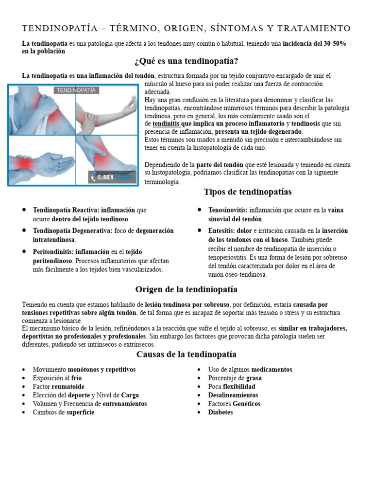 La tendinopatía es una patología que afecta a los tendones muy común o habitual, teniendo una incidencia del 30-50%