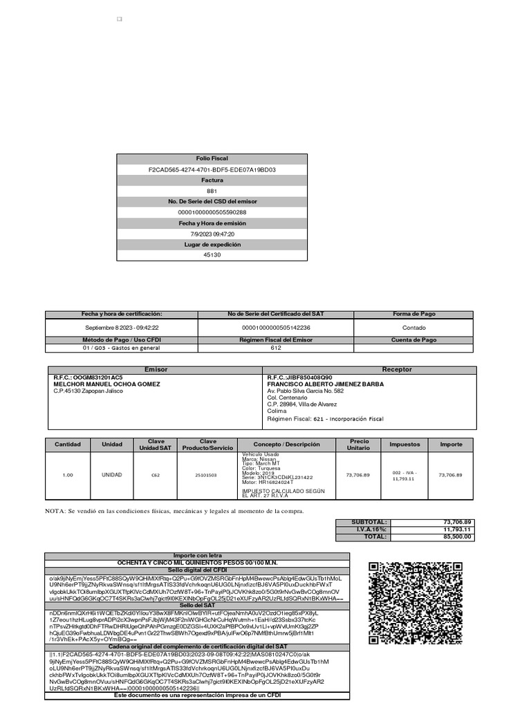 Este documento es una representación impresa de un CFDI
