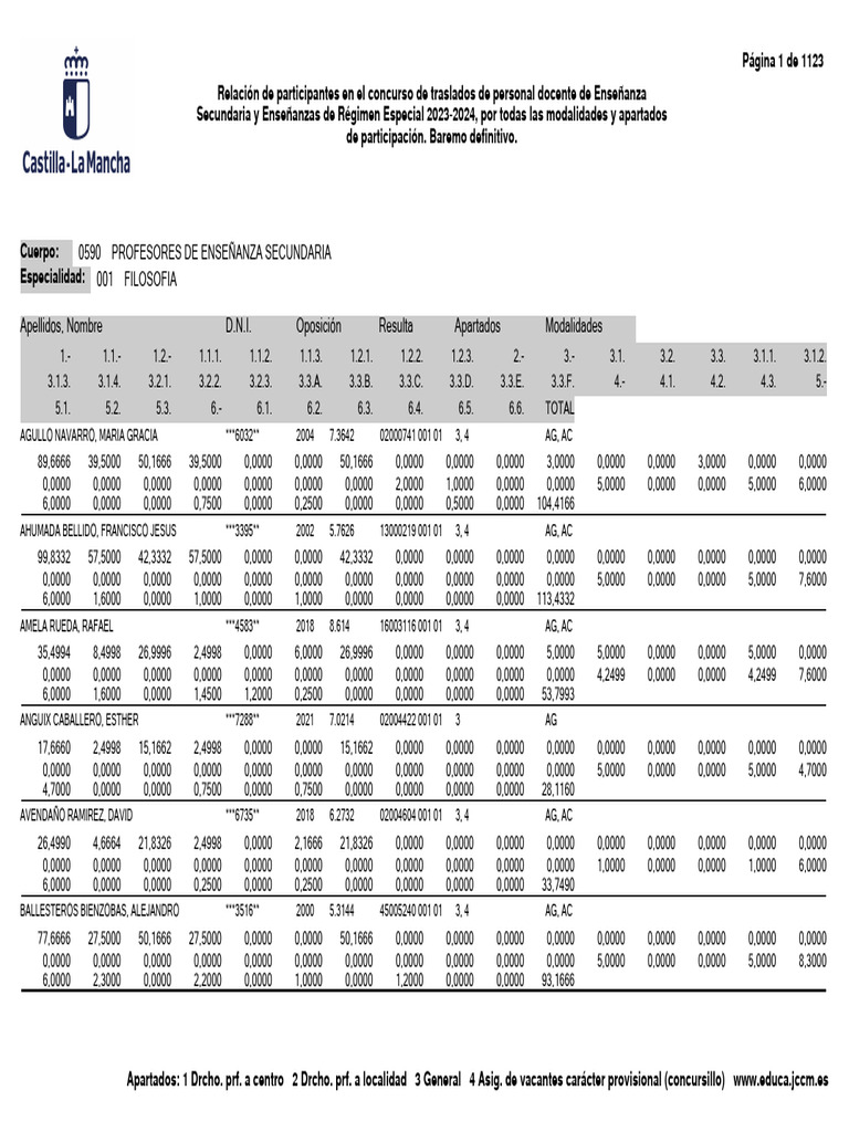 Relación de participantes en el concurso de traslados de personal docente de Enseñanza