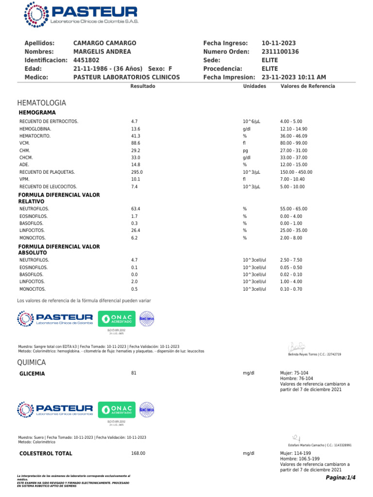 Medico: PASTEUR LABORATORIOS CLINICOS Fecha Impresion: 23-11-2023 10:11 AM