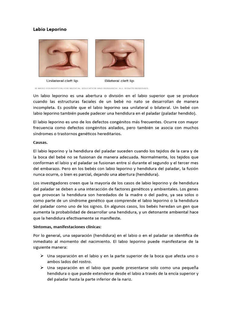inmediato al momento del nacimiento. El labio leporino puede manifestarse de la