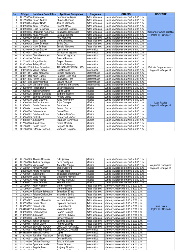 Código Nombres Completos Apellidos Completos Programa HORARIO DOCENTE
