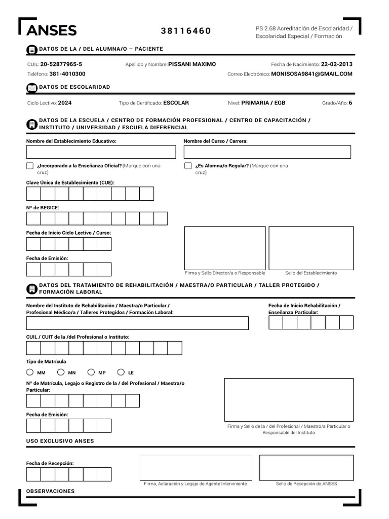 CUIL: 20-52877965-5 Apellido y Nombre: PISSANI MAXIMO Fecha de Nacimiento: 22-02-2013